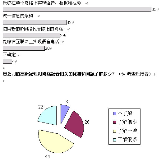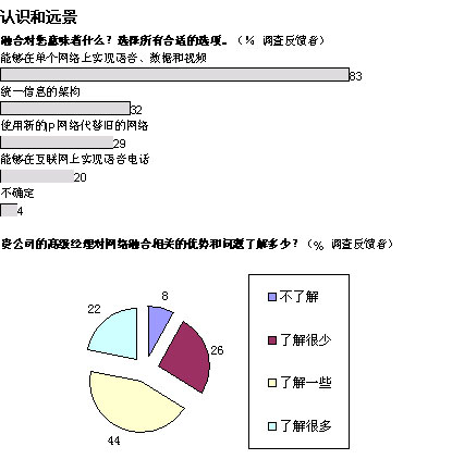 從更為廣泛的層面上看,我們的調(diào)查結(jié)果顯示:三分之一的管理人員對融合網(wǎng)絡的益處一無所知或者知之甚少。困惑的并不僅是高級經(jīng)理們:分析公司IDC近期對歐洲600余名廣域網(wǎng)管理人員進行的調(diào)查顯示,只有五分之一的人能夠完全了解融合網(wǎng)絡所實現(xiàn)的各項功能。