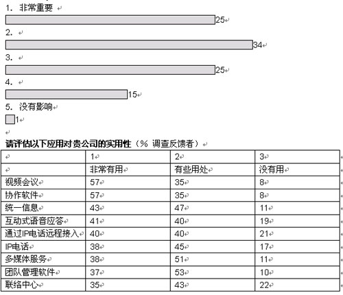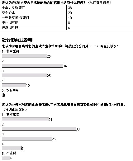我們調(diào)查的企業(yè)中,有超過三分之二將在未來五年內(nèi)實現(xiàn)大多數(shù)或者所有部門向融合網(wǎng)絡的轉(zhuǎn)型。大部分企業(yè)采取按部就班的形式在某些特殊部門和業(yè)務開始部署。在融合應用中,IP語音電話將在未來三年內(nèi)吸引大量投資;管理人士期望通過大幅削減公司內(nèi)部的通話費用獲得早期的回報。在更廣泛的層面上,大多數(shù)管理者預計,融合網(wǎng)絡對其企業(yè)的商業(yè)影響將會“非常重要”或者“重要”。