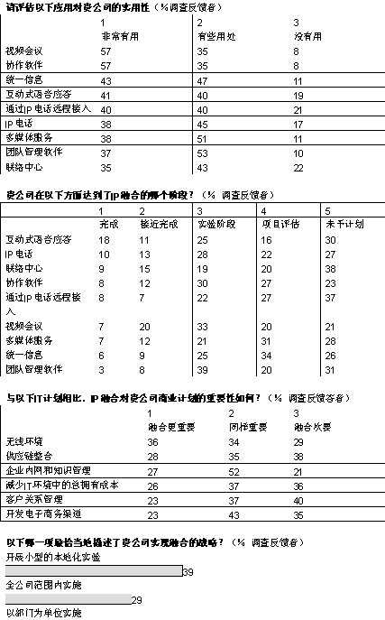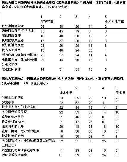 不久以前,“融合”這個詞給人的感覺是過分追捧技術(shù)和超前于時代的概念。此后不久,傳輸數(shù)據(jù)、語音和視頻的網(wǎng)絡融合逐漸成為現(xiàn)實。根據(jù)對103位高級經(jīng)理的調(diào)查結(jié)果表明,三分之二的企業(yè)正計劃在今后五年內(nèi)將其覆蓋整個企業(yè)的應用轉(zhuǎn)型為統(tǒng)一的IP網(wǎng)絡。四分之一的調(diào)查反饋者認為這對實現(xiàn)其企業(yè)戰(zhàn)略“尤為重要”。