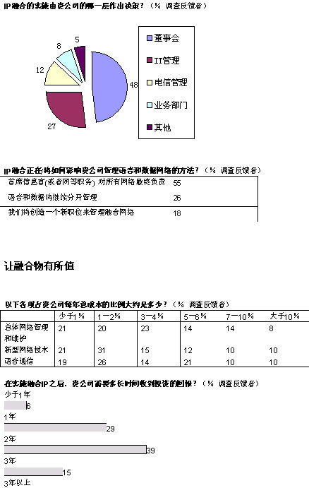 總之,這就是基本的理論。許多公司管理層對此表示贊成:在成熟的國家市場上,企業(yè)轉(zhuǎn)向融合網(wǎng)絡正在獲得青睞。但是,融合是否符合他們的預期?公司對融合網(wǎng)絡的運作有何計劃?從他們的經(jīng)驗中可以學到什么?