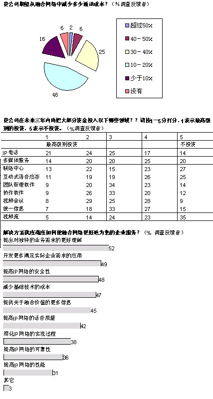 盡管如此,雖然IP融合的真正長期效益可能有利于提高員工效率,但是投資必須得到公司首席財務官的認可。在總體網(wǎng)絡成本中預計可以節(jié)約多少?大多數(shù)公司希望削減10%-20%的費用,也有相當一部分公司期望減少30%-40%的費用。上述報告中提到的實例中表明,這樣的節(jié)約是可以實現(xiàn)的。