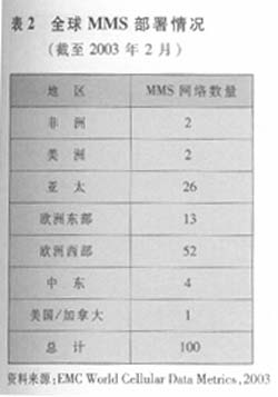 據EMC統(tǒng)計,到2003年2月,全球在47國家有100家運營商部署了MMS網絡(見表2)。