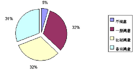 對(duì)于短信業(yè)務(wù)的使用情況,僅有31%的用戶認(rèn)為非常滿意,認(rèn)為比較滿意的用戶比較多,其比例占樣本總量的32%。認(rèn)為一般滿意和不滿意的用戶比例分別是32%和5%(見圖3)。