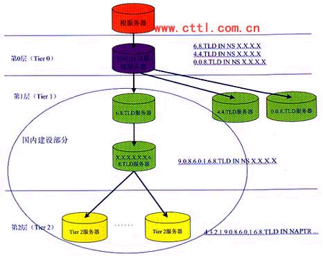 (1)第0層對應于ENUM的根域,在這一層中只有一個域,比如e164.tld。第0層的域名服務器中包含的記錄指向ENUM第1層的域名服務器。