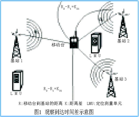 觀察到達(dá)時(shí)間差(OTDOA)是通過(guò)測(cè)量電波從發(fā)射機(jī)傳播到多個(gè)接收機(jī)的傳播時(shí)間差來(lái)確定目標(biāo)移動(dòng)臺(tái)的位置。初步測(cè)量通過(guò)UE接收的下行鏈路公共導(dǎo)頻信道的到達(dá)時(shí)間差實(shí)現(xiàn)。3個(gè)基站形成的平面上,一點(diǎn)到兩個(gè)固定點(diǎn)的距離差如為定值時(shí),該點(diǎn)必定在一條雙曲線上,兩條這樣的雙曲線的交點(diǎn)便可得到移動(dòng)臺(tái)的位置,如圖1