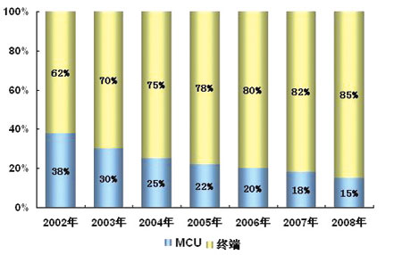 一般來說,終端和MCU是視頻會議系統(tǒng)產(chǎn)品最為關(guān)鍵的部分。計(jì)世資訊(CCW Research)的研究表明:近年來,終端的銷售比例持續(xù)增長,而MCU的銷售比例則相應(yīng)萎縮。2005年,終端和MCU的比例分別為78.0%和22.0%。