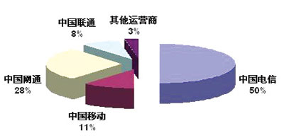 2005年中國NGN收入的主要的市場份額獲得者是在固網(wǎng)資源上有絕對優(yōu)勢地位的中國電信,其次是網(wǎng)通,2006年以后隨著3G網(wǎng)絡(luò)的部署,廣義的NGN業(yè)務(wù)的收入上,中國移動的市場份額會逐步上升。