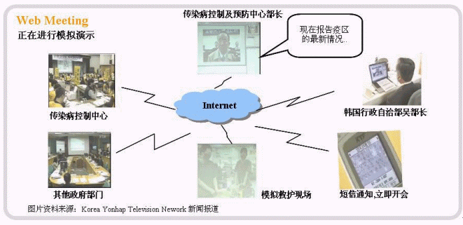 在韓國(guó)已經(jīng)安排多次的模擬演示,當(dāng)疫情在韓國(guó)發(fā)生及蔓延時(shí),由韓國(guó)傳染病控制及預(yù)防中心發(fā)出開(kāi)會(huì)通知,召集其他緊急醫(yī)療機(jī)構(gòu)、專(zhuān)家及政府部門(mén)(如行政自治部)等,一起進(jìn)行視像會(huì)議。在會(huì)議上,傳染病控制中心將各地收集回來(lái)的最新情況及報(bào)表共享給參會(huì)人及團(tuán)體。由各專(zhuān)家一起分析現(xiàn)況,進(jìn)行討論、判斷及決定解決辦法及措施。同時(shí)要求其他政府部門(mén)協(xié)調(diào)與全力幫助,目的是將疫情在最短的時(shí)間及在最少的范圍內(nèi)得到控制及處理,減少對(duì)人民生命安全及國(guó)家損失的影響。先進(jìn)的通訊科技能加快對(duì)危機(jī)發(fā)生時(shí),政府相關(guān)部門(mén)及機(jī)構(gòu)對(duì)事件的了解、分析、處理及決策,準(zhǔn)確傳達(dá)信息、加強(qiáng)信息的交流、提高辦事效率、加快決策速度以及落實(shí)措施及處理方法的執(zhí)行。最重要的事,將各方面的損失降到最低的程度,避免了事情的惡化及波及其他范圍的負(fù)面影響。
