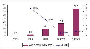 2005年中國運營商對WAP沉默用戶的清理和一系列內(nèi)容監(jiān)管措施使得WAP市場前兩年的高速增長勢頭減緩,SP市場規(guī)模增長率下探至75%,規(guī)模達17.9億元。諾盛預計由于運營商監(jiān)管政策的連續(xù)性及其對免費WAP網(wǎng)站的政策調(diào)整,2006年的WAP市場仍然無法恢復2004年以前的高速增長勢頭,但增長率略有回暖,達到120%。