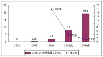 在運營商的大力推動和SP/CP的積極努力下,無線音樂市場從2004年起進入了井噴時期。CRBT業(yè)務具有的病毒式營銷特性使得CRBT業(yè)務的滲透率增長迅速,但其時尚特性又使得業(yè)務的滲透率高峰很容易達到、業(yè)務縱深有限。2005年,CRBT的SP市場規(guī)模增長率為376%,較上一年的高速增長有所回落。諾盛預計2006年運營商和SP/CP仍然會力推CRBT業(yè)務。在產(chǎn)業(yè)鏈積極推動和用戶滲透率高峰已經(jīng)逼近的雙重制約下,諾盛預計CRBT業(yè)務的SP市場規(guī)模增長率為138%,整體SP市場規(guī)模達到19.3億元。