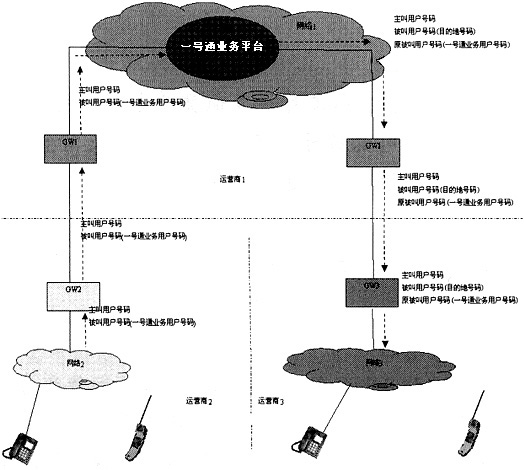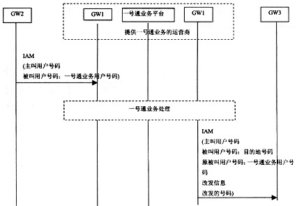 在圖1中,運(yùn)營商2的用戶撥叫運(yùn)營商1的一號(hào)通業(yè)務(wù)用戶號(hào)碼時(shí),呼叫將通過運(yùn)營商2的網(wǎng)關(guān)(GW2)、運(yùn)營商1的網(wǎng)關(guān)(GW1)接續(xù)到運(yùn)營商1的一號(hào)通業(yè)務(wù)平臺(tái)中。一號(hào)通業(yè)務(wù)平臺(tái)根據(jù)一號(hào)通業(yè)務(wù)用戶設(shè)置的接續(xù)規(guī)則,將呼叫翻譯到指定的目的地號(hào)碼。目的地號(hào)碼可能是運(yùn)營商1的用戶,也可能是其他運(yùn)營商的用戶。