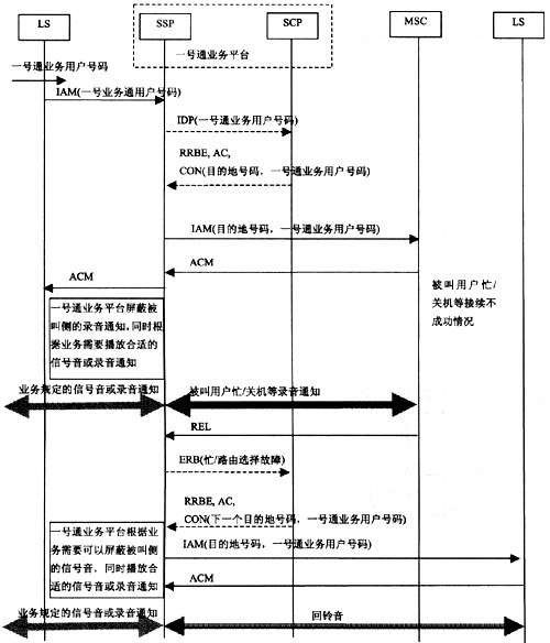 基于目前現(xiàn)網(wǎng)的信令處理方式,當(dāng)一號(hào)通業(yè)務(wù)用戶所設(shè)定的目的地號(hào)碼為移動(dòng)用戶時(shí),如果出現(xiàn)被叫用戶忙、關(guān)機(jī)等接續(xù)不成功情況,現(xiàn)有的移動(dòng)交換機(jī)會(huì)給主叫用戶播放錄音通知,通知用戶,如果主叫用戶不掛機(jī),則在通知播放完畢后向前端交換機(jī)后向返回REL消息,釋放呼叫。一號(hào)通業(yè)務(wù)平臺(tái)收到釋放消息后根據(jù)業(yè)務(wù)需要,進(jìn)行下次接續(xù)。如果按照原有的信令流程,主叫用戶會(huì)先聽到被叫用戶忙或關(guān)機(jī)的錄音通知,然后又聽到下一個(gè)呼叫的回鈴音。為了避免出現(xiàn)這種現(xiàn)象,一號(hào)通業(yè)務(wù)平臺(tái)要能夠屏蔽被叫側(cè)播放的錄音通知和信號(hào)音,并根據(jù)業(yè)務(wù)需要向主叫用戶播放合適的信號(hào)音或錄音通知,具體的屏蔽方式由一號(hào)通平臺(tái)自行確定。以智能網(wǎng)實(shí)現(xiàn)、ISUP消息為例,具體的消息流程如圖3所示。