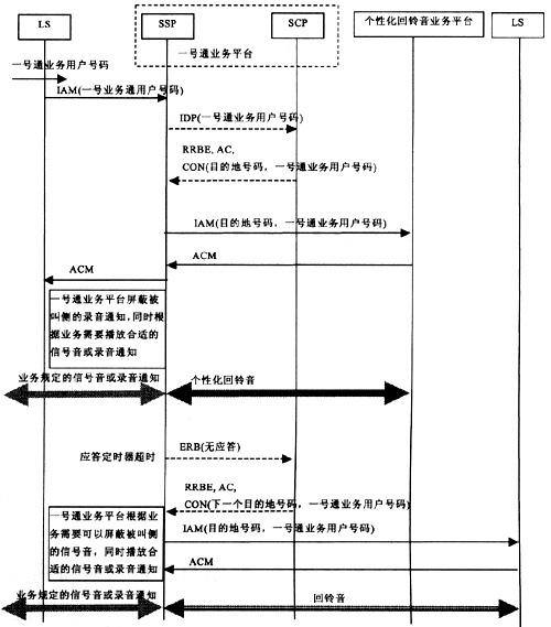 按照?qǐng)D3所示的信令方式,一號(hào)通業(yè)務(wù)平臺(tái)屏蔽被叫側(cè)錄音通知后,如果被叫用戶申請(qǐng)了個(gè)性化回鈴音業(yè)務(wù),則會(huì)產(chǎn)生一號(hào)通業(yè)務(wù)與個(gè)性化回鈴音業(yè)務(wù)之間的互斥性,即如果一號(hào)通業(yè)務(wù)用戶所設(shè)定的目的地號(hào)碼申請(qǐng)了個(gè)性化回鈴音業(yè)務(wù),個(gè)性化回鈴音業(yè)務(wù)平臺(tái)給主叫用戶播放的錄音通知會(huì)被一號(hào)通業(yè)務(wù)平臺(tái)所屏蔽,主叫用戶將聽到由一號(hào)通業(yè)務(wù)平臺(tái)統(tǒng)一播放的信號(hào)音或錄音通知,而聽不到個(gè)性化回鈴音。以智能網(wǎng)實(shí)現(xiàn)、ISUP消息為例,具體的消息流程如圖4所示。