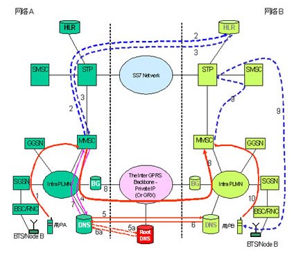 用戶A發(fā)送MM消息給用戶B。MM消息通過(guò)網(wǎng)絡(luò)A的SGSN(Serving GPRS Support Node)、GGSN(Gateway