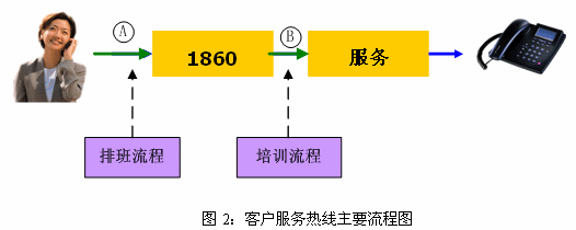 因此,根據(jù)客戶服務(wù)中心的實(shí)際情況,我們首先優(yōu)化了排班流程,建立并優(yōu)化了培訓(xùn)流程。我們首先選擇這兩個(gè)流程的思路如下:從客戶角度來(lái)看,10086熱線在接受用戶咨詢服務(wù)時(shí)的主要流程如下:撥號(hào)→1860→服務(wù)提供→掛機(jī)。圖示如下: