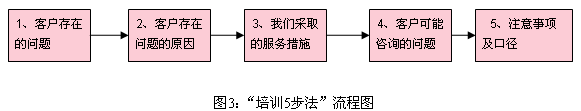 從上圖,我們可以看出,影響服務(wù)質(zhì)量主要有A、B兩個(gè)關(guān)鍵控制點(diǎn),決定A點(diǎn)服務(wù)質(zhì)量的主要是排班流程,它影響客戶接入的速度和客戶的等待時(shí)間,即決定了10086的接通率;決定B點(diǎn)服務(wù)質(zhì)量的主要是培訓(xùn)流程,它直接影響服務(wù)人員的業(yè)務(wù)知識(shí)和服務(wù)能力,從而影響服務(wù)質(zhì)量。由此,我們優(yōu)化了排班流程、新建了客服代表的培訓(xùn)流程,有效地保證了上述關(guān)鍵環(huán)節(jié)的服務(wù)質(zhì)量。排班流程優(yōu)化的具體方法在筆者的前一篇文章《流程與組織能力》中已經(jīng)作了詳細(xì)的介紹,下面結(jié)合實(shí)際來(lái)介紹我們新的培訓(xùn)流程-“培訓(xùn)五步法”。
