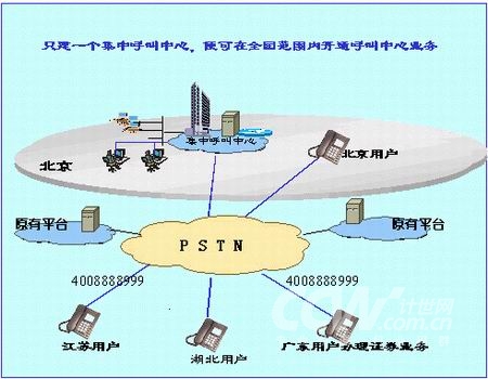 企業(yè)希望通過呼叫中心向客戶提供客戶服務(wù),原來沒有呼叫中心平臺,則應(yīng)用中國電信"一碼通"業(yè)務(wù),只建一個(gè)集中呼叫中心,便可在全國范圍內(nèi)開通呼叫中心業(yè)務(wù)。企業(yè)應(yīng)用該方案,初期投資只包括一個(gè)呼叫中心平臺,從而實(shí)現(xiàn)投資少、見效快、迅速開拓業(yè)務(wù)市場的目的。