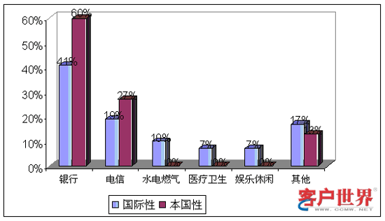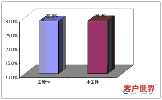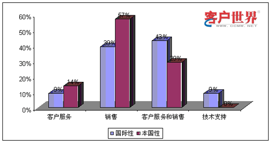 從業(yè)務(wù)功能看來,國際性呼叫中心和本國性呼叫中心承擔(dān)著不同的角色。9%的國際性呼叫中心和14%的本國性呼叫中心提供僅限于客戶服務(wù),例如賬號(hào)查詢和催費(fèi)收款。39%的國際性呼叫中心和59%的本國性呼叫中心專門展開網(wǎng)上營銷和銷售(外撥為主)。43%的國際性呼叫中心和29%的本國性呼叫中心同時(shí)承擔(dān)客戶服務(wù)和銷售功能。最后,我們調(diào)查到9%的國際性呼叫中心專門從事技術(shù)支持,而且這些中心專門為國際市場設(shè)立。服務(wù)功能上的差異會(huì)對(duì)商業(yè)定位和人力資源管理提出不同的要求。