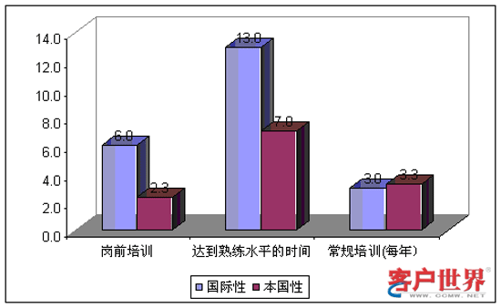 總體看來,印度呼叫中心提供平均為4.1周的崗前培訓(xùn)。其中,國際性呼叫中心平均提供6周崗前培訓(xùn),明顯高于本地性呼叫中心的2.3周。這是因?yàn)閲H呼叫中心把崗前培訓(xùn)的相當(dāng)一部分時(shí)間投入到英語能力的培訓(xùn)和提高上面。此外,參加調(diào)研的呼叫中心主管認(rèn)為,新員工平均在開始工作10周以后才能達(dá)到熟練水平。同樣地,我們發(fā)現(xiàn)國際性呼叫中心和本地性呼叫中心在這一指標(biāo)上存在顯著差異。在國際性呼叫中心需要達(dá)到熟練水平的時(shí)間