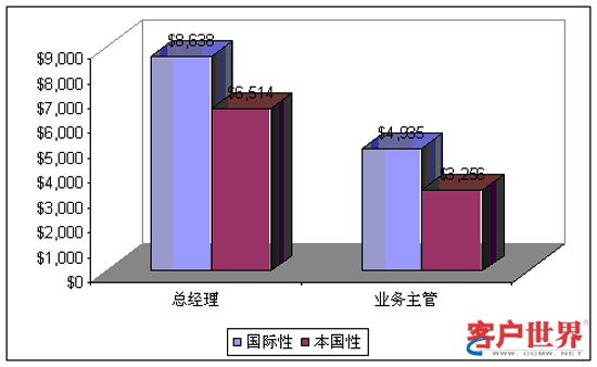 管理人員的薪酬水平明顯高于一線人員的薪酬水平。呼叫中心總經(jīng)理的年收入達(dá)到$8,194,其中在國際性呼叫中心為$8,638而在本地性呼叫中心為$6,514。對(duì)于業(yè)務(wù)主管來說,平均年工資為$4,253,其中在國際性呼叫中心$4,935而在本地性呼叫中心$3,256。
