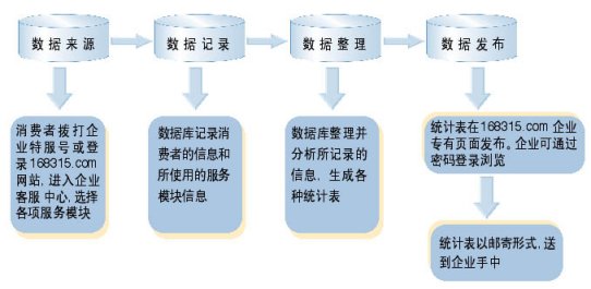 "企業(yè)客戶服務系統(tǒng)"統(tǒng)計數(shù)據(jù)分析功能,能幫助企業(yè)管理人員適時監(jiān)控"企業(yè)客戶服務系統(tǒng)"的運行情況,自動采集消費者在使用"企業(yè)客戶服務系統(tǒng)"過程的相關數(shù)據(jù),并分類整理成數(shù)據(jù)庫,為企業(yè)經(jīng)理人投資決策提供重要的數(shù)據(jù)支持。企業(yè)經(jīng)理人只需登陸客戶服務網(wǎng)站www.168315.com,按照"168315客戶服務中心"提供的用戶名和密碼登錄,即可隨時下載"企業(yè)客戶服務系統(tǒng)"的運行數(shù)據(jù),瀏覽客戶檔案庫。也可以由"中心"的服務人員將統(tǒng)計結(jié)果通過E-mail、傳真或郵寄的方式送到企業(yè)經(jīng)理人手中,如下圖: