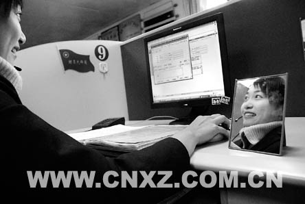 12319服務(wù)熱線中心有13個工作臺,每個工作臺前都有一面鏡子。該中心的負責同志說,這面鏡子是檢驗工作人員是否微笑服務(wù)的“晴雨表”。鏡子是今年初安裝的,大家還給它起了一個響亮的名字:“微笑鏡”。