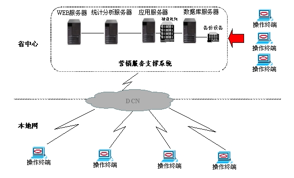 省中心/分公司營銷服務(wù)支撐系統(tǒng)由兩臺IBM服務(wù)器形成雙機集群,同時安裝有數(shù)據(jù)庫服務(wù)器、WEB服務(wù)器、應(yīng)用服務(wù)器、統(tǒng)計分析服務(wù)器。