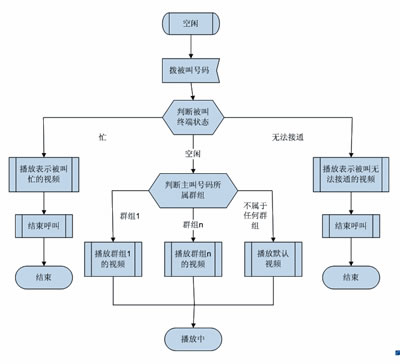 多媒體彩鈴用戶可以為某一位或某一組主叫用戶設(shè)定不同的視頻,當某個主叫用戶來電時,系統(tǒng)根據(jù)被叫用戶的狀態(tài)和主叫所屬的群組播放不同的視頻。如果被叫忙或者無法接通,則播放能表達被叫當前狀態(tài)的默認系統(tǒng)視頻;如果被叫空閑,則根據(jù)主叫號碼所屬的群組播放被叫為該群組定制的視頻。無論在哪種情況下,主叫都可以在手機上欣賞到精彩的視頻媒體。圖1是多媒體彩鈴業(yè)務(wù)使用流程。