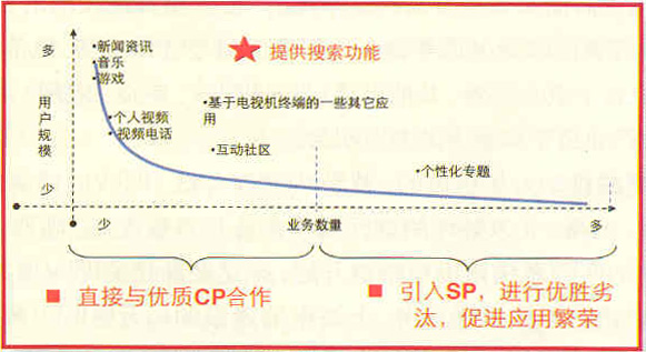 增值業(yè)務(wù)內(nèi)容定位可參考長尾理論模型。長尾理論的頭部通常是大眾市場(chǎng),要求產(chǎn)品滿足用戶符號(hào)化的需求,主流業(yè)務(wù)將具備更廣的流行效應(yīng),如新聞、游戲和音樂,頭部的業(yè)務(wù)往往能夠滿足大規(guī)模用戶需求,提供優(yōu)質(zhì)業(yè)務(wù)體驗(yàn);尾部通常是細(xì)分市場(chǎng)和互動(dòng)市場(chǎng),要求業(yè)務(wù)滿足生產(chǎn)與消費(fèi)一體化的需求,體現(xiàn)交互性,為用戶帶來整合的、一對(duì)一的體驗(yàn),以促進(jìn)IPTV應(yīng)用繁榮。