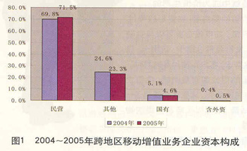 電信增值市場的開放和政策環(huán)境的優(yōu)化,也吸引了眾多的外資企業(yè)。電信增值服務的投資來源、經(jīng)營主體、服務目標、經(jīng)濟功能與基礎電信業(yè)務存在明顯差異,彼此間有競爭關系,但更多的是補充、豐富的關系。目前,我國已放開電信增值市場準入,從2005年起,整個電信增值業(yè)務市場就呈現(xiàn)出持續(xù)快速發(fā)展的勢頭,民營資本已經(jīng)發(fā)展成為電信增值業(yè)務領域的主力軍,其所占企業(yè)數(shù)量比例已超過70%(見圖1)。