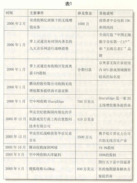 從2003年開始,國內(nèi)就顯現(xiàn)出并購增值服務運營企業(yè)的苗頭。2004年以來,隨著整治增值服務運營企業(yè)的力度不斷加大,并購漸成風潮(見表1)。2004年2月,新浪收購深圳網(wǎng)興科技公司;2004年5月,搜狐收購手機WAP服務提供商北京吉菲爾公司。2005年,在“超級女生”節(jié)目大獲成功后,掌上靈通宣布將對國內(nèi)著名的九天音樂網(wǎng)進行戰(zhàn)略投資,全面打造“中國正版數(shù)字音樂第一門戶”和“無線百老匯”品牌。各大移動增值業(yè)務服務商通過并購競爭對手,門戶網(wǎng)站可以在移動增值服務領域尋求新的突破,獲得可觀的利益,增強自身的競爭力。伴隨著3G商用的日益臨近和市場競爭的不斷加劇,主流SP(服務提供商)進一步加快了資本購并和業(yè)務整合的步伐,整個SP行業(yè)將加速洗牌。經(jīng)過市場整合,主流SP將不斷做大做強,而相當多的缺乏市場競爭力的SP將被淘汰出局。