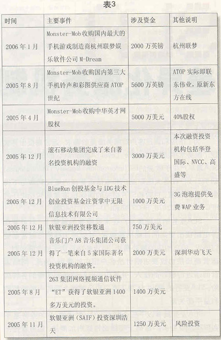 近幾年來,一些資本投資商將投資的重點放到了無線音樂、手機游戲和手機視訊等業(yè)務領域,逐步加大了對SP的投資力度(見表3)。進入2005年以來,著眼于2.5G向3G的全面演進,風險投資對SP的投資力度進一步加大。以滾石移動為例,在2002年和2004年獲得兩輪風險投資之后,滾石移動憑借在無線音樂領域取得的良好市場業(yè)績,又獲得了智基創(chuàng)投、華登國際、聯(lián)想投資等公司的投資,投資金額達3000萬美元。繼2004年10月獲得IDG投資以后,2005年12月7日,國內(nèi)著名的數(shù)字音樂門戶——A8音樂集團獲得了包括IDG和Intel投資公司在內(nèi)的5家國際著名投資機構的投資,投資金額達2000萬美元。同月,掌中無限則獲得了來自全球性風險投資商BlueRun創(chuàng)投基金和IDG總額達上千萬美元的投資。