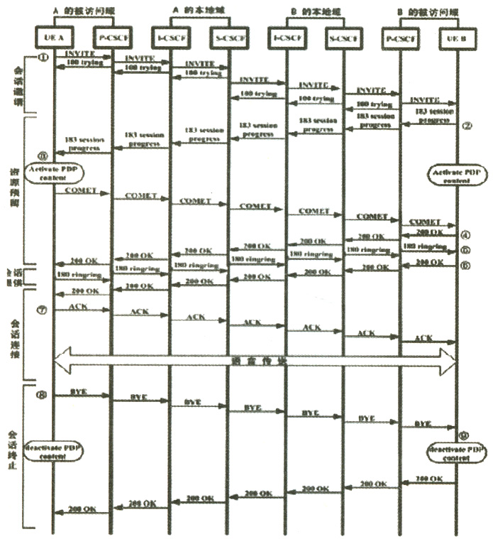 B接受了這個(gè)會(huì)話(huà)請(qǐng)求,但此時(shí)他不回鈴?fù)ㄖ狝,他返回183sessionprocess應(yīng)答表示他接受該會(huì)話(huà),同時(shí)要求A對(duì)此表示確定,這個(gè)應(yīng)答通過(guò)各個(gè)CSCF傳給A。同時(shí)B激活一個(gè)GPRSPDP上下文,它被用來(lái)通過(guò)IMS的IP接入點(diǎn)來(lái)建立語(yǔ)音通道。