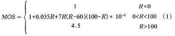 (5)MOS值,MOS模型是主觀評(píng)價(jià)方法,根據(jù)E模型MOS值是通過(guò)R值計(jì)算得到的。MOS值是1~5之間的數(shù),1是最差的,5是最好的[6]。R和MOS值的關(guān)系式如下所示: