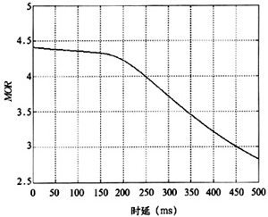 對(duì)實(shí)時(shí)的語(yǔ)音和視頻業(yè)務(wù)來(lái)說(shuō),業(yè)務(wù)數(shù)據(jù)端到端的時(shí)延最為關(guān)鍵,從仿真結(jié)果圖6和圖7可以看出時(shí)延對(duì)R系數(shù)和MOS值的影響:隨著時(shí)延的增加,R系數(shù)和MOS值都降低,即語(yǔ)音質(zhì)量變差。當(dāng)時(shí)延大于150ms時(shí),語(yǔ)音質(zhì)量下降的比較厲害。