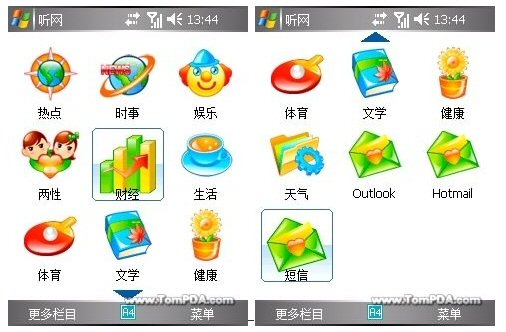 用戶登錄后會(huì)進(jìn)入聽網(wǎng)軟件的“頻道面板”,這是“移動(dòng)聽網(wǎng)”軟件的主界面,看上去相當(dāng)華麗,整合了豐富多彩的熱點(diǎn)信息,這里面的小圖標(biāo)分別代表熱點(diǎn)、時(shí)事、娛樂、兩性、財(cái)經(jīng)、生活、體育、文學(xué)、健康、天氣,除此之外,還集成了短信項(xiàng),根據(jù)用戶的設(shè)置還可以有Outlook和Hotmail,幾乎涵蓋了所有內(nèi)容,滿足了不同人群的需求。