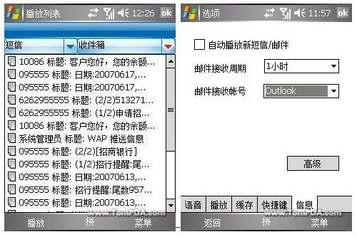 除了向大家介紹的收聽資訊外,“聽網(wǎng)”還可以根據(jù)用戶的需要播報(bào)短消息及郵件。在選項(xiàng)卡設(shè)置中用戶還可以選擇是否自動(dòng)播放新短信及郵件、郵件接收周期和接收帳號(hào)。