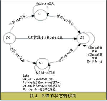 在總結(jié)了前人工作經(jīng)驗和結(jié)合本系統(tǒng)的實際問題的基礎上,我們在對話管理的具體實現(xiàn)上,將框架理論和有限狀態(tài)自動機理論相結(jié)合,完成了一個智能的對話管理模塊。我們先將對話管理限制在天氣查詢領(lǐng)域。在系統(tǒng)中,通過人機之間的對話和確認,系統(tǒng)需要得到要查詢的時間和地點信息之后反饋查詢結(jié)果。