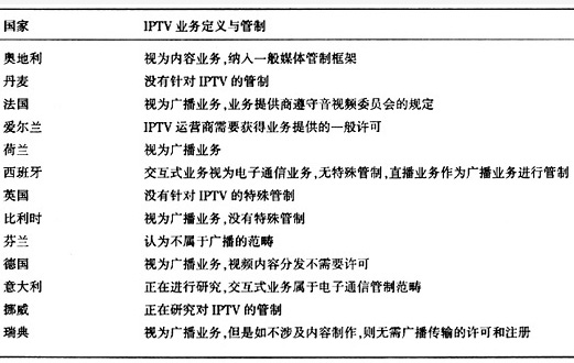 管制環(huán)境對IPTV的影響是根本性的。這種根本性主要體現(xiàn)在IPTV的準入和業(yè)務劃分上,前者決定電信公司是否能夠經(jīng)營IPTV,后者則決定IPTV應如何管理。