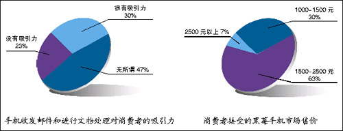 另一個調(diào)查項目展現(xiàn)了這個問題的另一面。調(diào)查顯示,只有28%的消費者知道黑莓手機的核心功能是郵件的Push功能和在線文件處理。并且,在這些人中,83%的人認為這個功能的收費令他們無法接受。