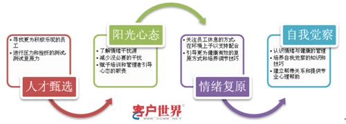 在上述的這三類員工中,我們更希望培養(yǎng)的是第一類,最不想見到的是第三類。但天生就具有很強(qiáng)情緒管理能力的員工,是可望不可求的。如果僅僅是依賴人員的天賦,管理也會陷入更多的“surprise”中,在幾百上千人的呼叫中心出現(xiàn)不可控的局面。我們需要的,也許是個系統(tǒng)化的工程,能夠直面呼叫中心員工需要“情緒勞動”的特點(diǎn),從另外一個角度去理解和改善員工的表現(xiàn),梳理各項(xiàng)相關(guān)工作,按照如下的步驟形成員工支持體系: