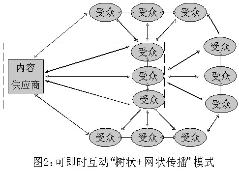 我們認為,手機短信新聞的傳播方式,是“樹狀+網(wǎng)狀傳播”,即由新聞內(nèi)容提供方完成點到面的“樹狀傳播”后,信息接受終端又可以完成一個“網(wǎng)狀傳播”。因此,手機短信新聞,不僅傳播鏈較長,而且可以相互交錯形成網(wǎng)狀互動,“傳者”和“受者”可以隨時出現(xiàn)“角色互換”。(見圖2)