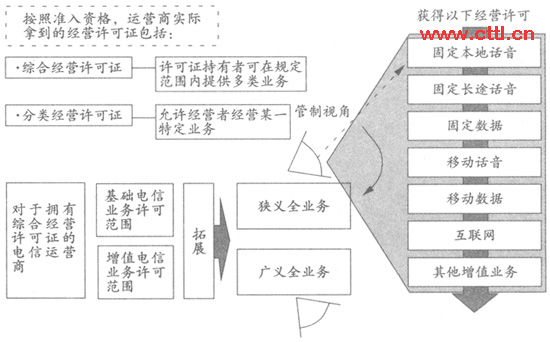 全業(yè)務可從電信管制、業(yè)務屬性及市場三個角度進行定義。全業(yè)務運營則可以從兩個角度來看待,一是從管制視角帶來的狹義全業(yè)務;一是從多業(yè)務領(lǐng)域與電信結(jié)合的廣義全業(yè)務。具體表述可參照圖1。