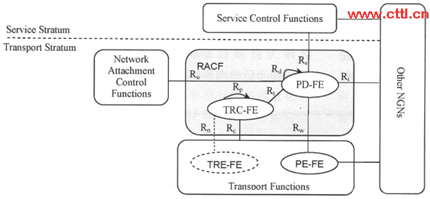RACF由策略決策功能實體PD-FE和傳送資源控制功能TRC-FE兩個功能實體組成。PD-FE基于網(wǎng)絡(luò)策略規(guī)則、業(yè)務(wù)控制功能SCF提供的業(yè)務(wù)信息、網(wǎng)絡(luò)附著控制功能NACF提供的傳送層簽約信息,以及TRC-FE提供的資源接納決策結(jié)果,做出網(wǎng)絡(luò)資源接納控制的最后決策?梢曰诿總流對傳送層的策略執(zhí)行功能實體。PE-FE下發(fā)資源接納控制策略。TRC-FE負(fù)責(zé)收集和維護(hù)傳送網(wǎng)的拓?fù)浜唾Y源狀態(tài)信息,基于拓?fù)洹⑦B接性、網(wǎng)絡(luò)、節(jié)點資源的可用性以及接入網(wǎng)中的傳送層簽約信息等網(wǎng)絡(luò)信息控制資源的使用,提供傳送網(wǎng)絡(luò)接納控制的決策。PD-FE通過Rt參考點請求TRC-FE檢測或者決定所請求的媒體流路徑上的QoS資源。