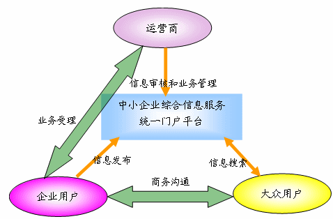 “中小企業(yè)綜合信息服務(wù)統(tǒng)一門(mén)戶平臺(tái)”的角色包括:運(yùn)營(yíng)商、企業(yè)用戶、大眾用戶三大角色。各角色與平臺(tái)之間及角色之間的業(yè)務(wù)關(guān)系如下: