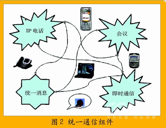 通信的終端可能是桌面電話、計算機、手機或者PDA。這4個部分之間存在緊密的聯(lián)系,比如說電話語音可以轉換為統(tǒng)一消息;電話不可達時,可以采用即時消息溝通或者小組成員可以使用多種方式參與到同一個會議中來等等。而所有這些聯(lián)系可能建立在統(tǒng)一的平臺之上: