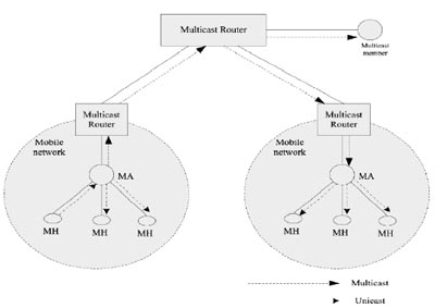 IETF的移動(dòng)IP協(xié)議定義了家鄉(xiāng)代理(home Agent,簡(jiǎn)稱HA)、外地鏈路、外地代理(foreign Agent,簡(jiǎn)稱FA)、通信對(duì)端等概念,一個(gè)移動(dòng)節(jié)點(diǎn)擁有兩個(gè)IP地址:家鄉(xiāng)地址和轉(zhuǎn)交地址。節(jié)點(diǎn)在移動(dòng)過程中,家鄉(xiāng)地址不改變,發(fā)送到該節(jié)點(diǎn)的數(shù)據(jù)都通過家鄉(xiāng)地址與轉(zhuǎn)交地址之間的隧道轉(zhuǎn)發(fā)給移動(dòng)節(jié)點(diǎn)。當(dāng)組成員切換時(shí),包括網(wǎng)絡(luò)鏈路間切換的固有時(shí)延,以及重新加入組播組以及建立組播轉(zhuǎn)發(fā)樹的時(shí)延,都將導(dǎo)致組播成員丟包。