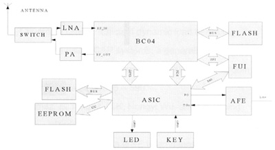 其中,BC04支持最大4個活動連接(包括耳機),同時支持兩路SCO語音,所以語音通過PCM和ASIC PCM相接可以有多路被送到模擬端,從而實現(xiàn)3方通話。ASIC部分實現(xiàn)PCM語音數(shù)據(jù)與模擬語音信號的相互轉(zhuǎn)換,通過發(fā)送和接收PSTN信令,負(fù)責(zé)對人機界面的控制。它通過GPIO(General