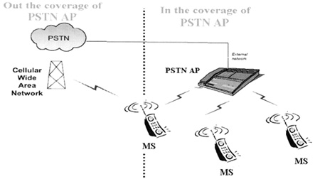 如圖3所示,使用藍(lán)牙CTP MS(mobile station)和PSTN AP,通過本地交換機與固網(wǎng)相連。其中,MS為雙模終端,可以根據(jù)不同網(wǎng)絡(luò)的資費差異預(yù)先設(shè)置采用何種網(wǎng)絡(luò)接打電話。在藍(lán)牙覆蓋范圍內(nèi),根據(jù)設(shè)置,CTP