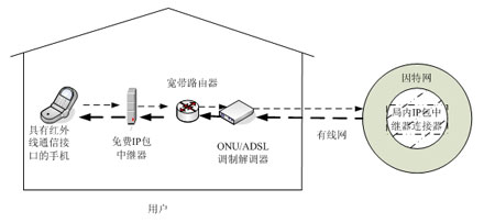 to Point Protocol over Ethernet)方式連接到ONU或ADSL的調(diào)制解調(diào)器上,手機通過有線寬帶接入網(wǎng)與采用TCP/IP協(xié)議的因特網(wǎng)就連接起來了,這樣手機用戶就可去享受免費IP包服務(wù)。